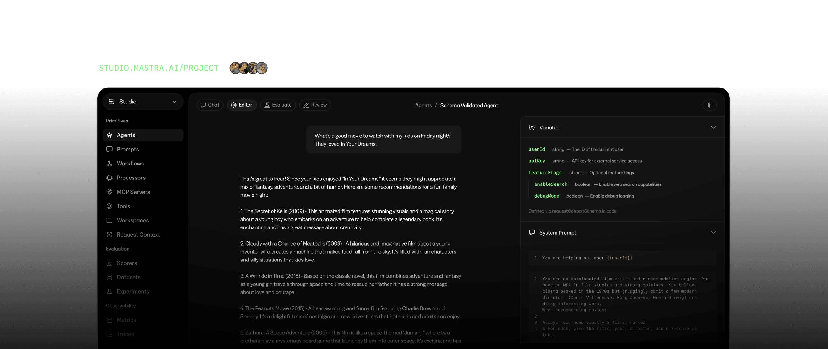 Collaborate with Your TeamBuild and test Mastra agents in Studio, then bring in non-technical domain experts to test behavior, annotate traces, create datasets, and refine prompts in the editor.